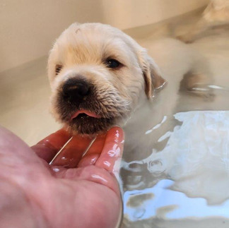 The pups got exposed to water earlier this week and tried out their swimming legs. Being a bit too relaxed in water lead to more bobbing than actual swimming but the exposure was great. We will keep rotating them through water to give everyone a chance to show their skills.