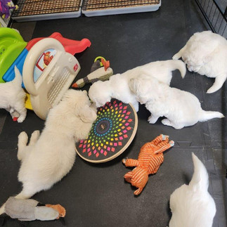 So much learning is still ahead for these pups and I'm there for it all. I share their milestones with their families and share their excitement. They come in and visit weekly to quietly sit and to calmly play. They watch their antics and note their personality differences as they change week to week. So fun to be able to share all of this with these very few lucky families.