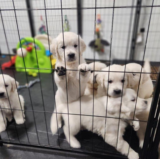 Unfortunately the rain rolled in yesterday in sheets forcing me to make the difficult decision to cancel visits for the day. So sorry to everyone that was eager to come in! Playing in the cold and down pouring rain doesn't bring much fun to anyone. The pups stayed cozy and warm tucked into their spaces for the day. I'm crossing my fingers for brighter skies and a touch of warmth again by next weekend. The pups at this point are real little dogs just getting bigger by the day. By next weekend they will pretty much be the same as they are this week, only plumper, more confident and blooming personally in every form possible.